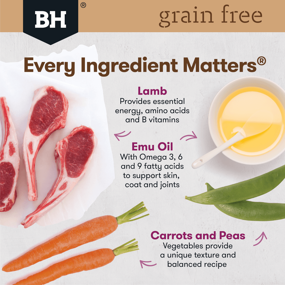 Lamb, Chicken, Carrots, Peas, Potato, Gelling Agents, Flavours including Rosemary, Vitamins and Minerals (Choline Chloride, Vitamin E, Pantothenic Acid, Vitamin B1, Vitamin B2, Vitamin B6, Biotin, Vitamin D3, Folic Acid, Vitamin B12, Sodium Tripolyphosphate, Sodium Chloride, Calcium Carbonate, Potassium Chloride, Zinc Sulphate, Magnesium Oxide, Calcium Iodate, Sodium Selenite), Natural Colour, Oils including Emu Oil